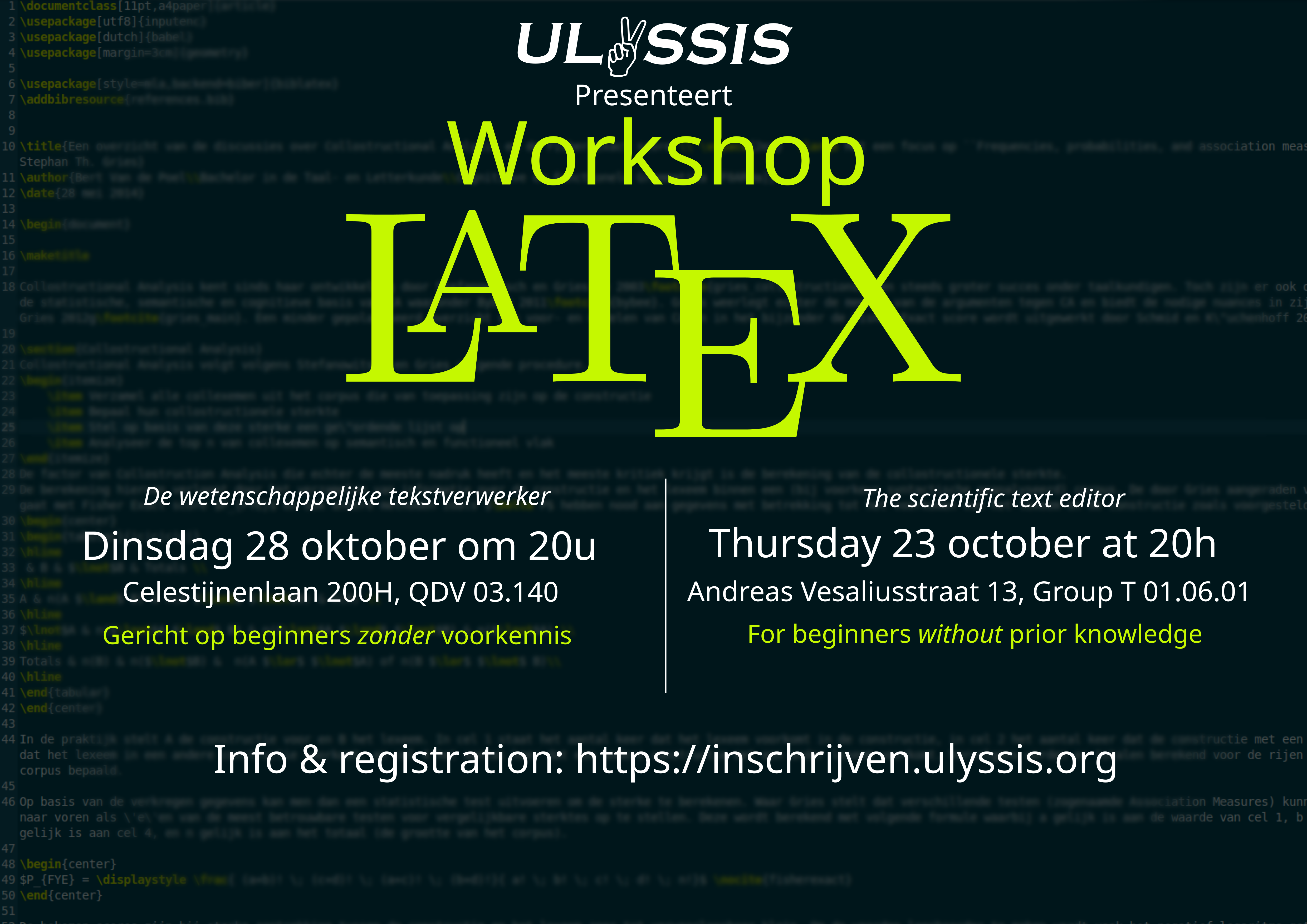 Het is noodzakelijk om LaTeX volledig op voorhand te installeren en te configureren. We kunnen tijdens de workshop geen installaties begeleiden. Instructies en een inschrijfformulier kan je vinden op https://inschrijven.ulyssis.org