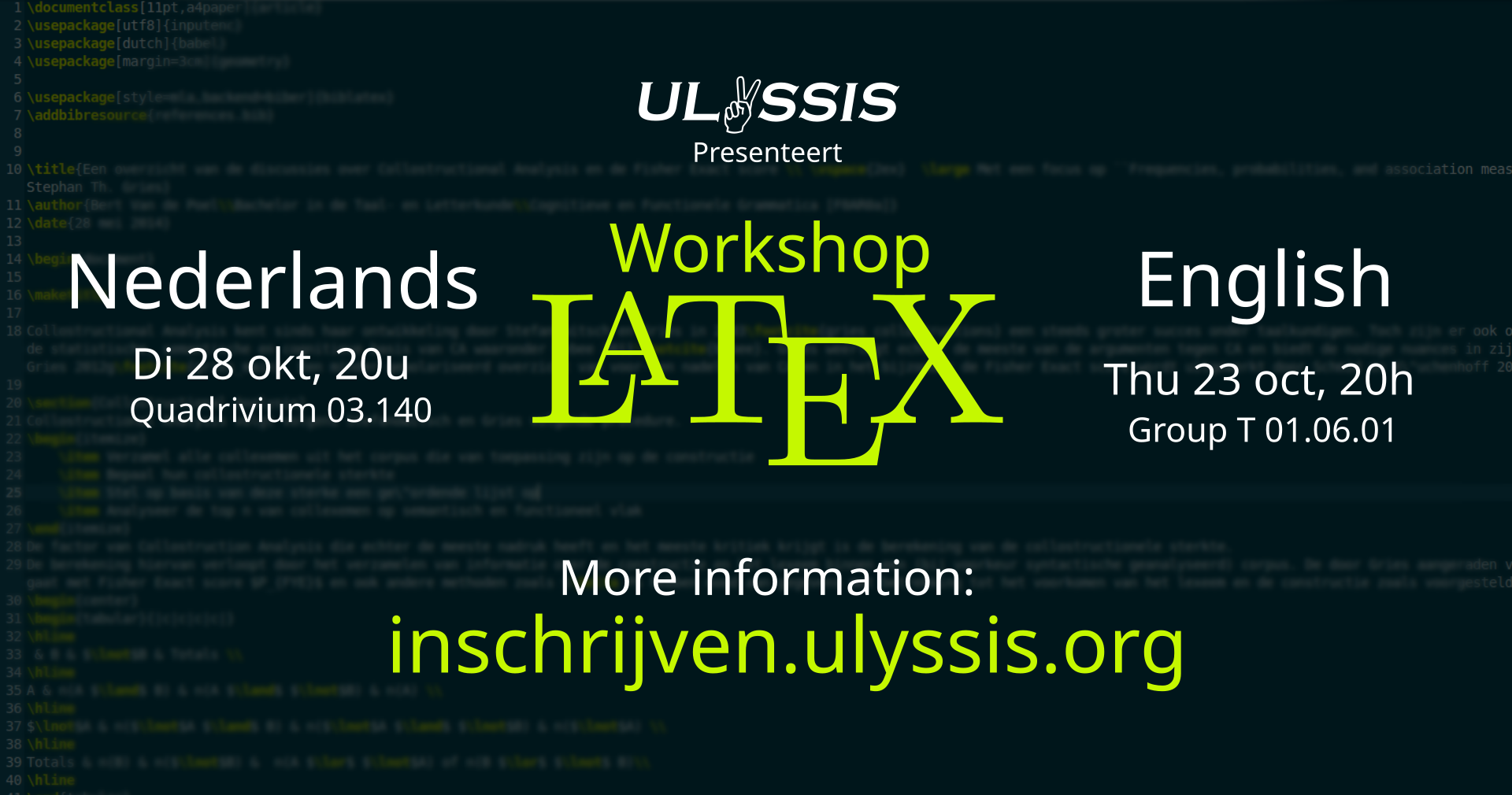 Het is noodzakelijk om LaTeX volledig op voorhand te installeren en te configureren. We kunnen tijdens de workshop geen installaties begeleiden. Instructies en een inschrijfformulier kan je vinden op https://inschrijven.ulyssis.org